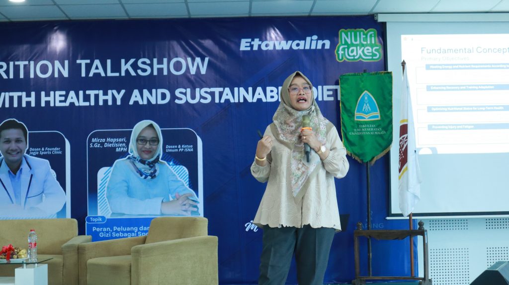 Diskusi berlangsung interaktif dengan dimoderatori oleh dosen Program Studi Gizi Universitas Alma Ata, Hastrin Hositanisita, yang memandu alur tanya jawab serta memperdalam pembahasan terkait peluang karier dan kolaborasi multidisiplin di bidang gizi olahraga.